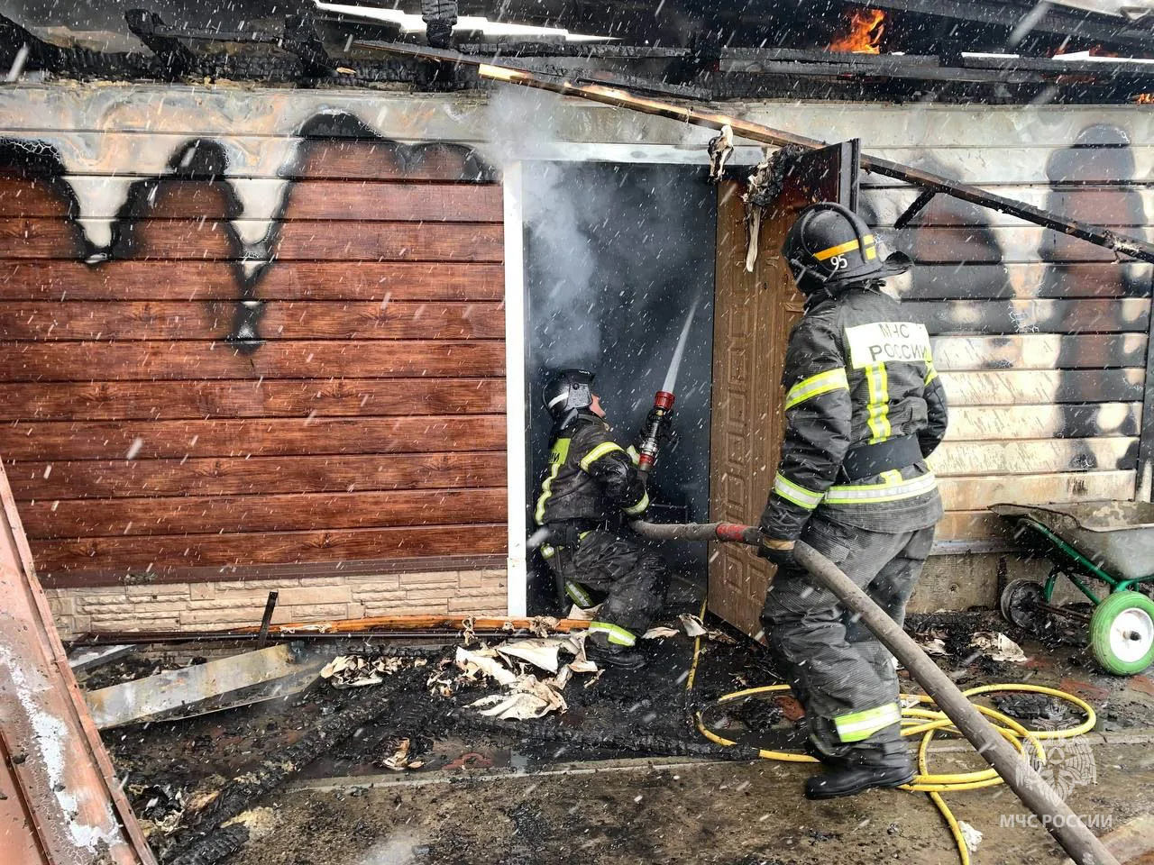В садовом товариществе «Сказка» Березовского района горели гараж и котельная под общей кровлей (фото 3, 4, 5). 8 человек и 3 единицы техники ликвидировали пожар на площади 100 м. Его предварительная причина - короткое замыкание в электроприборе.