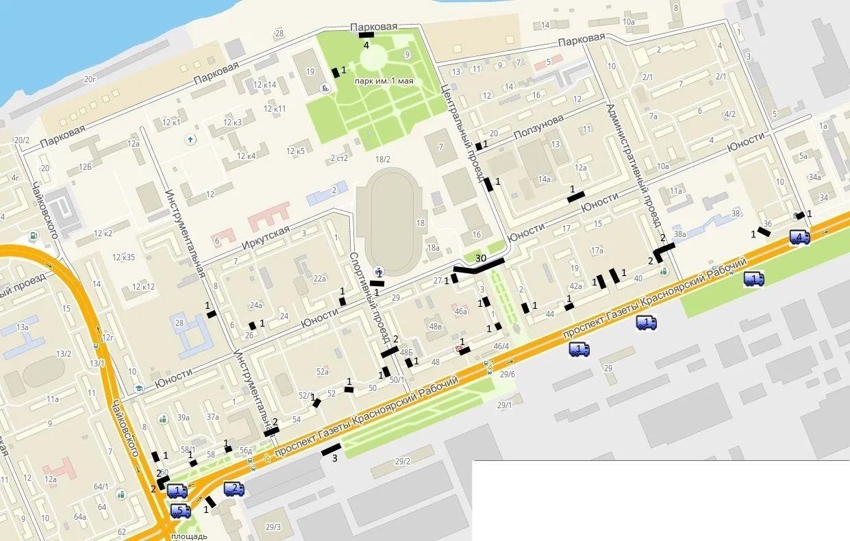 Также с 09:00 29 апреля до 20:00 9 мая запрещён въезд транспортных средств пр. им. газ. «Красноярский рабочий» на проезды между домами № 36 и № 38, № 40 и № 42, № 42 и № 44, № 46 и № 48, № 50 и № 52, № 52 и № 54, № 56 и № 58, № 58 и № 60.
