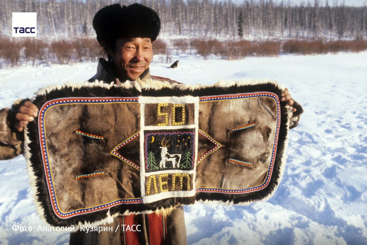 Мастер вышивки декоративных эвенкийских ковриков — кумаланов демонстрирует свое изделие.