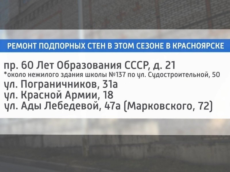 Стены, находящиеся в муниципальной собственности, уже начали инспектировать. В этом году капитальный ремонт проведут как минимум на пяти крупных объектах. Среди адресов: проспект 60 лет образования СССР, 21; улица Пограничников, 31а; Красной Армии, 18 и другие. Всего в городе более 300 подпорных стен. За последние пять лет отремонтировали уже больше сотни. На этот сезон в бюджете заложено 73 миллиона рублей, сообщили в администрации.