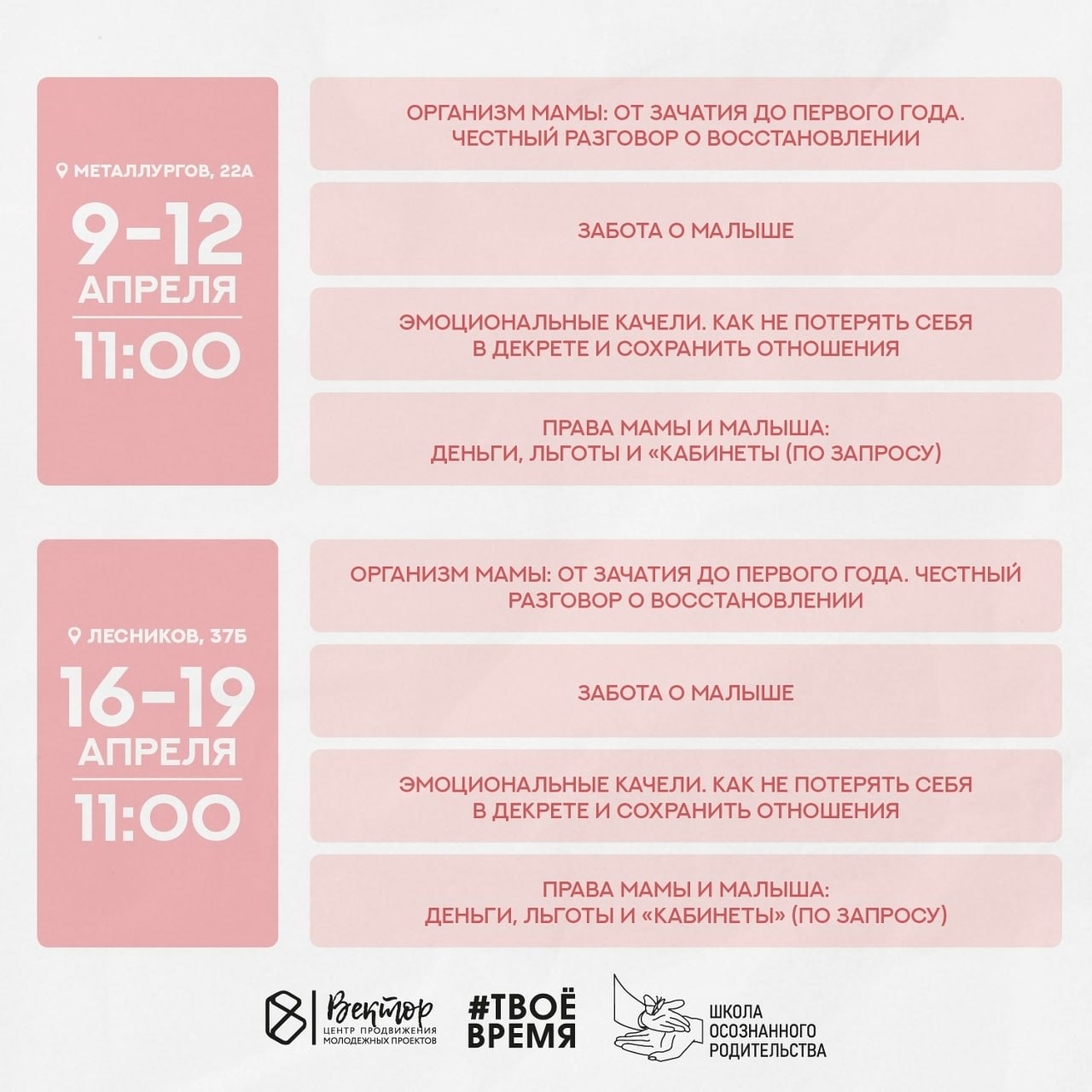 Участников ждут лекции и мастер-классы по физической и психологической подготовке к рождению малыша, а также базовым навыкам ухода за ребёнком.