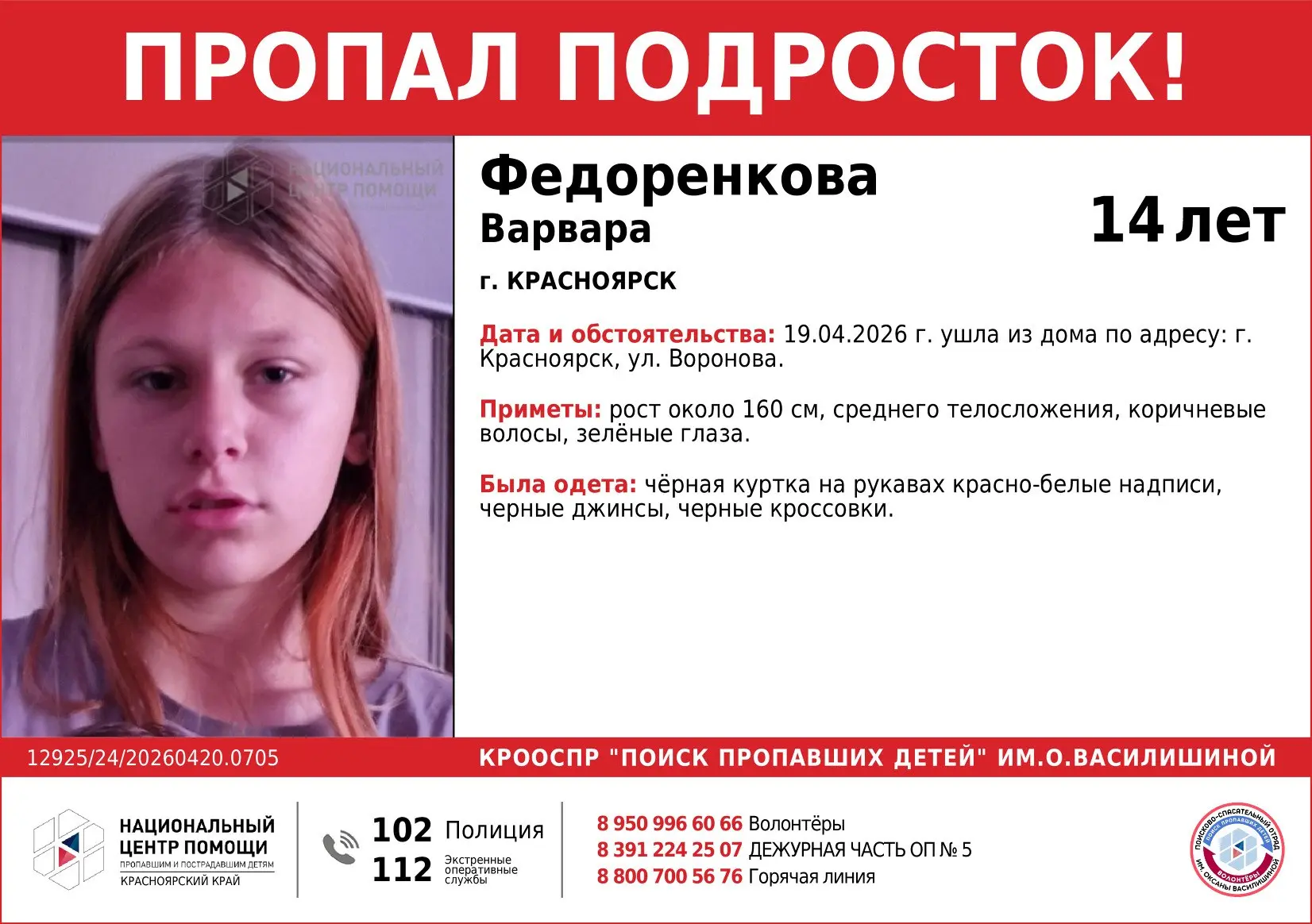 14-летняя школьница ушла из дома по улице Воронова. Ее рост около 160 сантиметров, сама среднего телосложения, с русыми волосами и зелеными глазами. Была одета в черную куртку с красно-белыми надписями на рукавах, черные джинсы и черные кроссовки.