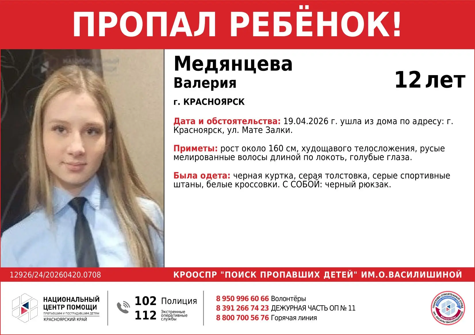 Еще одна пропавшая живет на улице Мате Залки. 12-летняя девочка ростом 160 сантиметров, худая, с русыми мелированными волосами длиной до локтя и голубыми глазами. Была одета в черную куртку, серую толстовку, серые спортивные штаны и белые кроссовки. С собой у нее был черный рюкзак