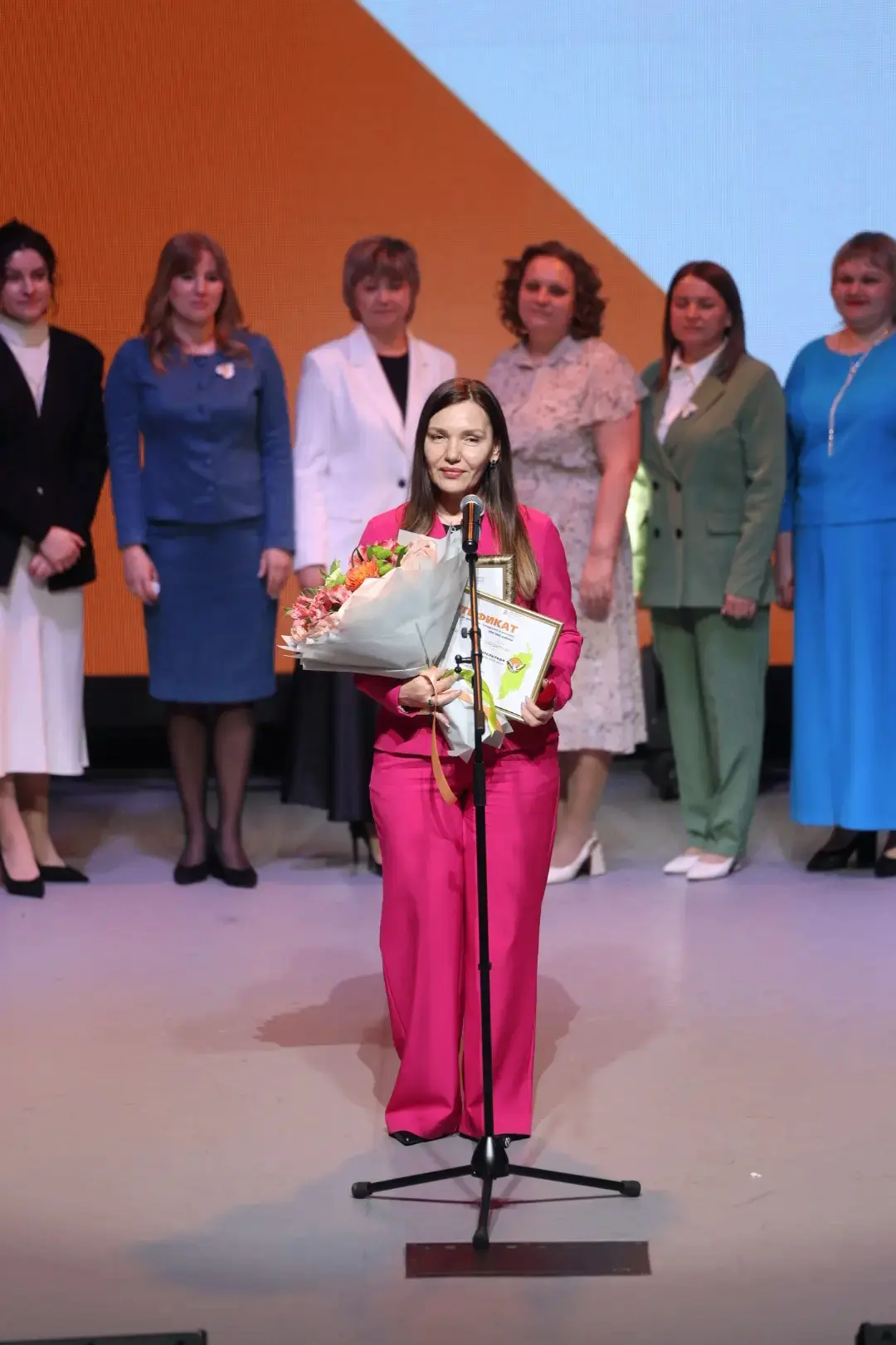 Золотой значок и сертификат на денежное вознаграждение в размере 700 тысяч рублей ей вручила министр образования Красноярского края Татьяна Гридасова.