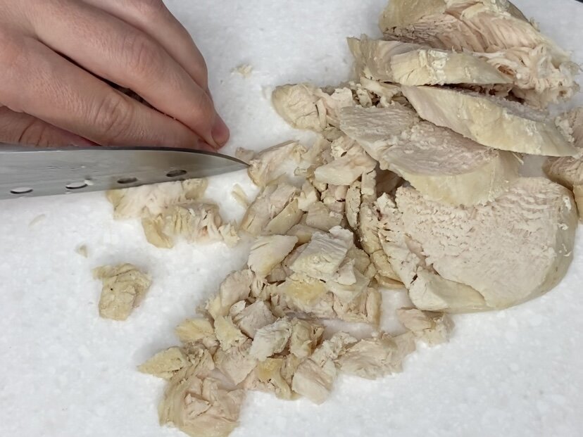 Сначала куриную грудку нужно отварить в подсоленной воде, затем нарезать небольшими кубиками и переложить в глубокую посуду. Далее берётся спелый помидор: серединка удаляется, а мякоть нарезается кубиками и добавляется в салатник с курицей.