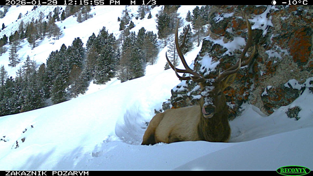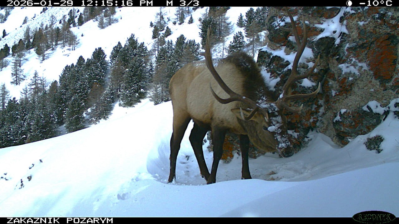 На днях, обрабатывая данные с фотоловушек заказника «Позарым имени В. М. Зимина», сотрудники заповедника «Хакасский» наткнулись на невероятно фотогеничного марала. Это редкий кадр, где дикое животное застигнуто врасплох снегопадом.