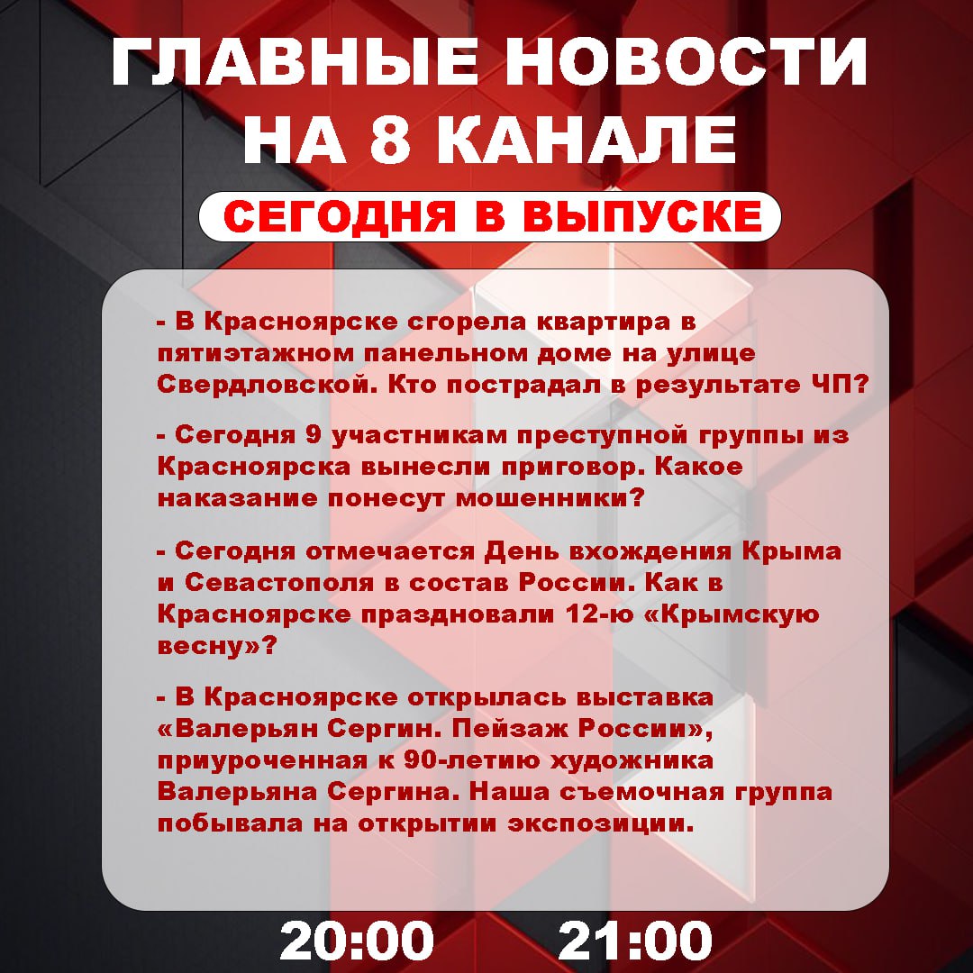 - Город просыпается и ... замирает в пробках. Как решить проблему заторов на дорогах Красноярска?- Ловушка потепления: в Красноярском крае зафиксирован рост заболеваемости ОРВИ и гриппом.- Незваный визитёр. К жителям Назарова в квартиру через окно...