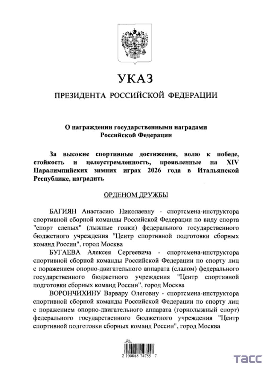 Президент России Владимир Путин подписал указ, согласно которому победителей Паралимпиды-2026 года наградят орденами