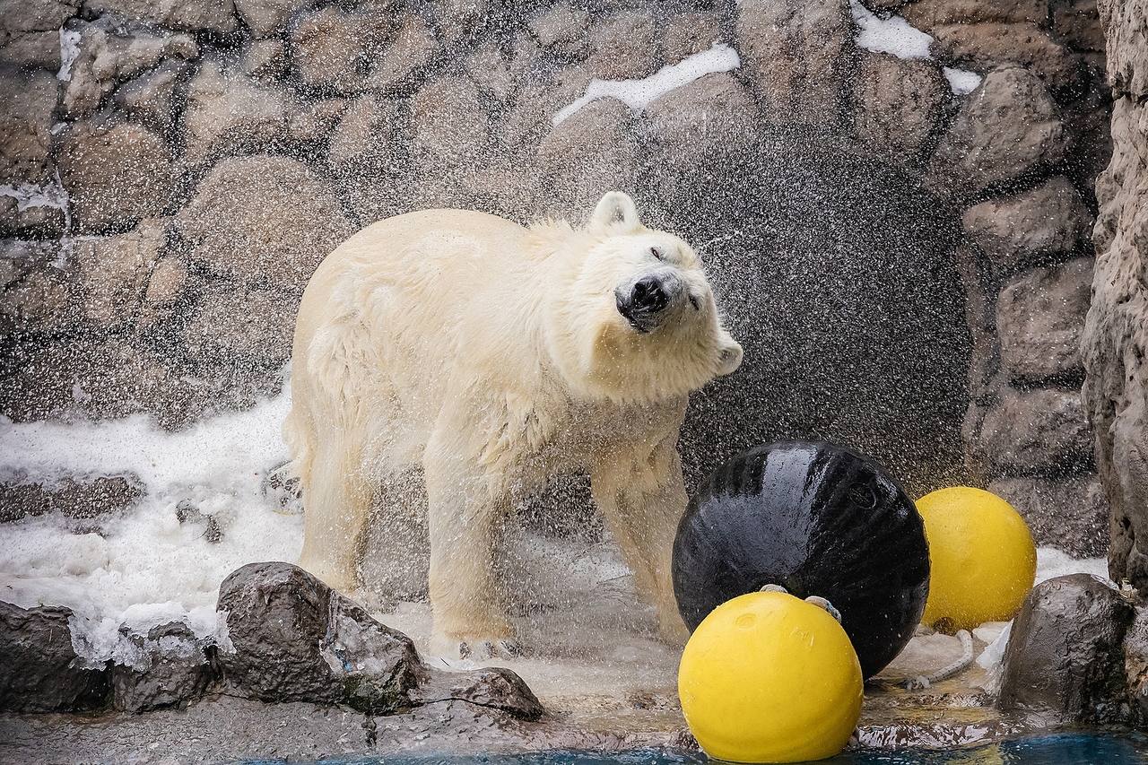Прекрасные животные дня: белые медведи в Красноярском крае открыли купальный сезон. Урсула и Ермак уже наслаждаются водой: плавают, ныряют и играют. Урсула особенно любит прыгать в бассейн с разбега и обдавать посетителей брызгами.