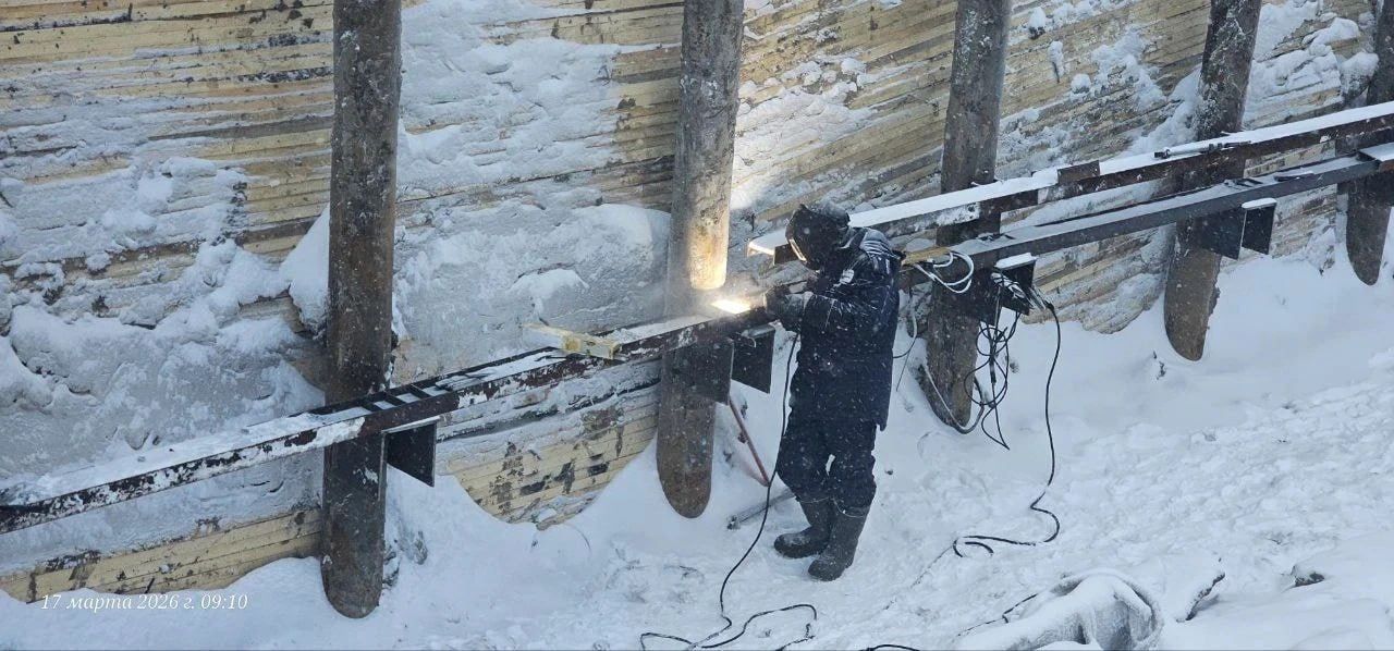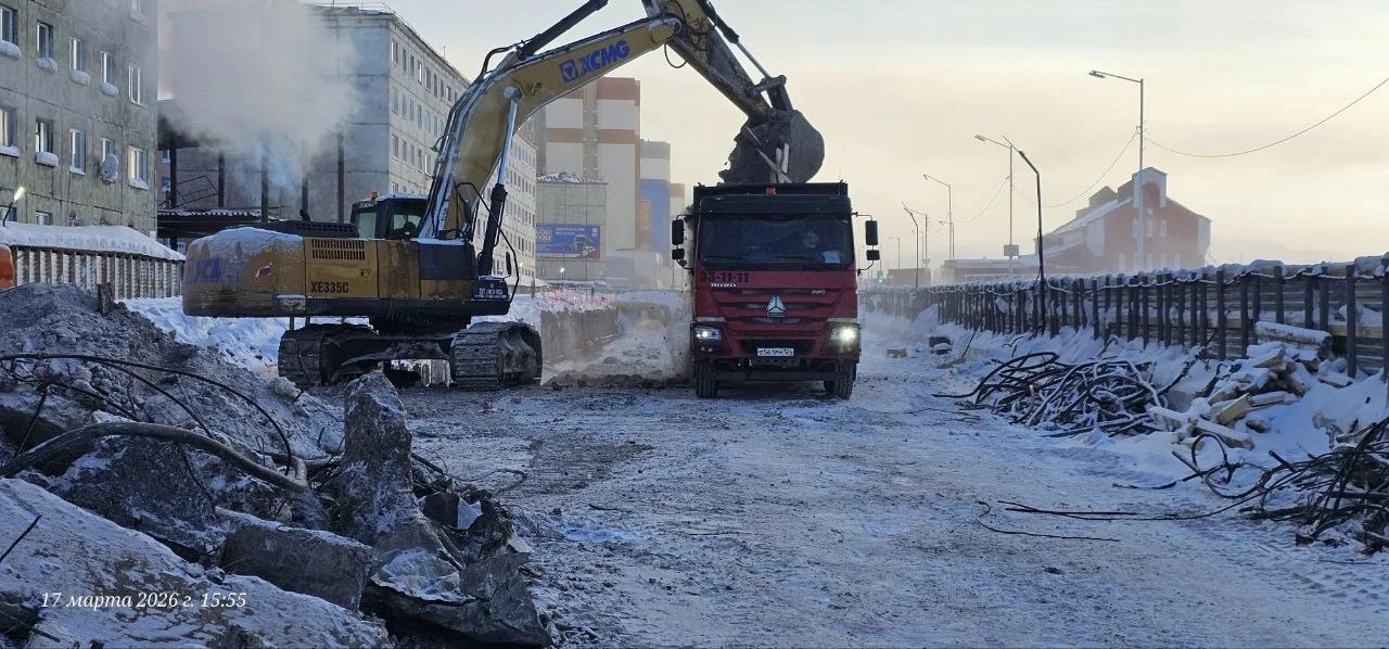 Игорь Епифанов, заместитель министра и ЖКХ: «Несмотря на то, что в Норильске до сих пор сильные морозы и температура редко поднимается выше минус тридцати градусов, на стройплощадке работает строительная техника – экскаваторы, самосвалы, кран. Рабочие укладывают трубы в подготовленные траншеи и сваривают их, монтируют рёбра жёсткости для укрепления откосов котлована для перераспределения нагрузки и предотвращения деформации трубопровода».