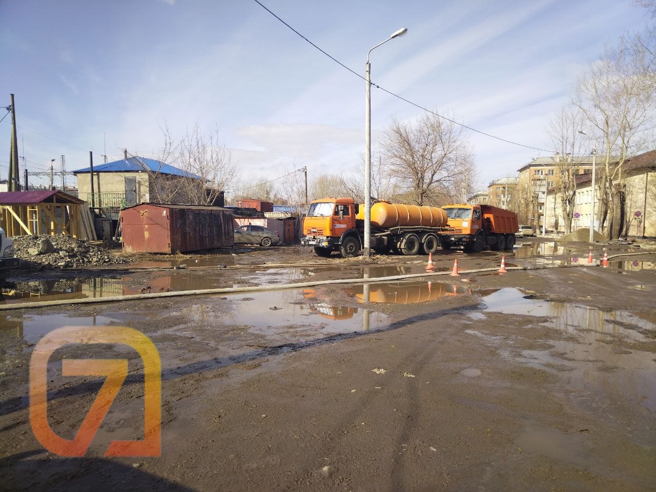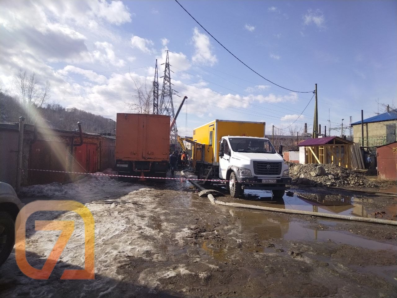 Потоки воды хлынули с горы, затапливая гаражный массив. Причиной стала подвижка грунта, из-за которой разорвало трубу.