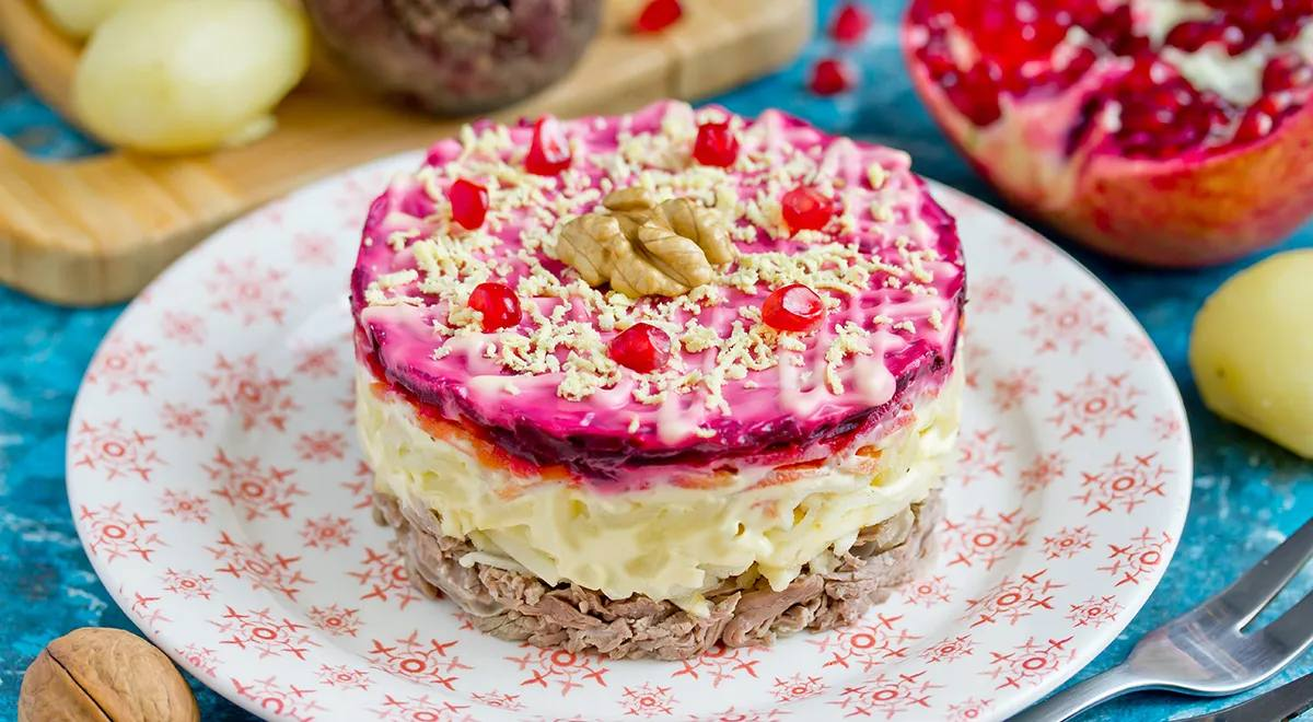 - Слоеный салат с говядиной: Этот салат станет настоящей звездой стола благодаря своему оформлению и насыщенным вкусам.