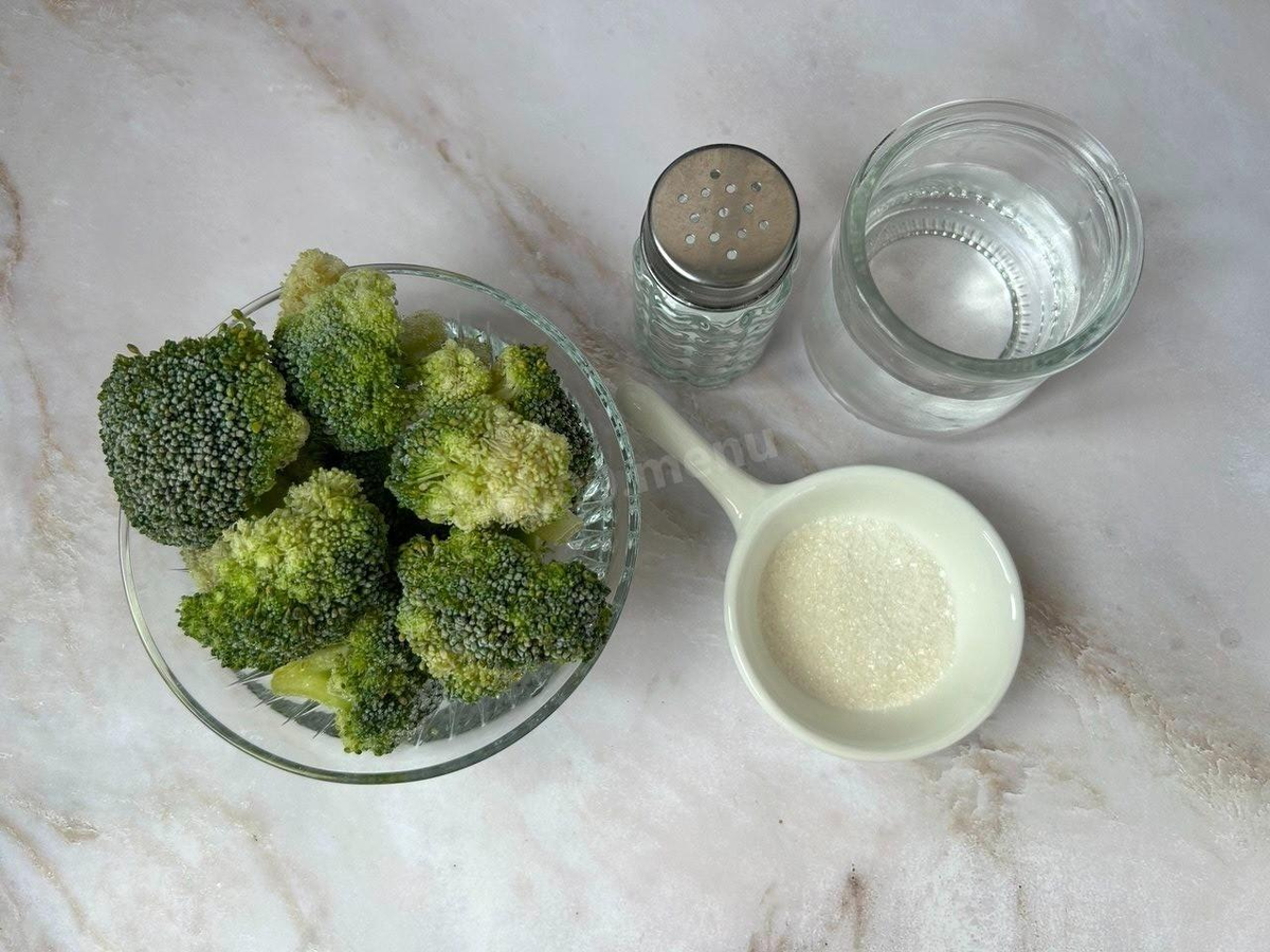 Шаг 3: В отдельной мисочке смешать воду, сахар и соль. На этом этапе можно добавить любимые специи для усиления аромата. Залить брокколи полученной смесью и плотно закрыть крышкой.