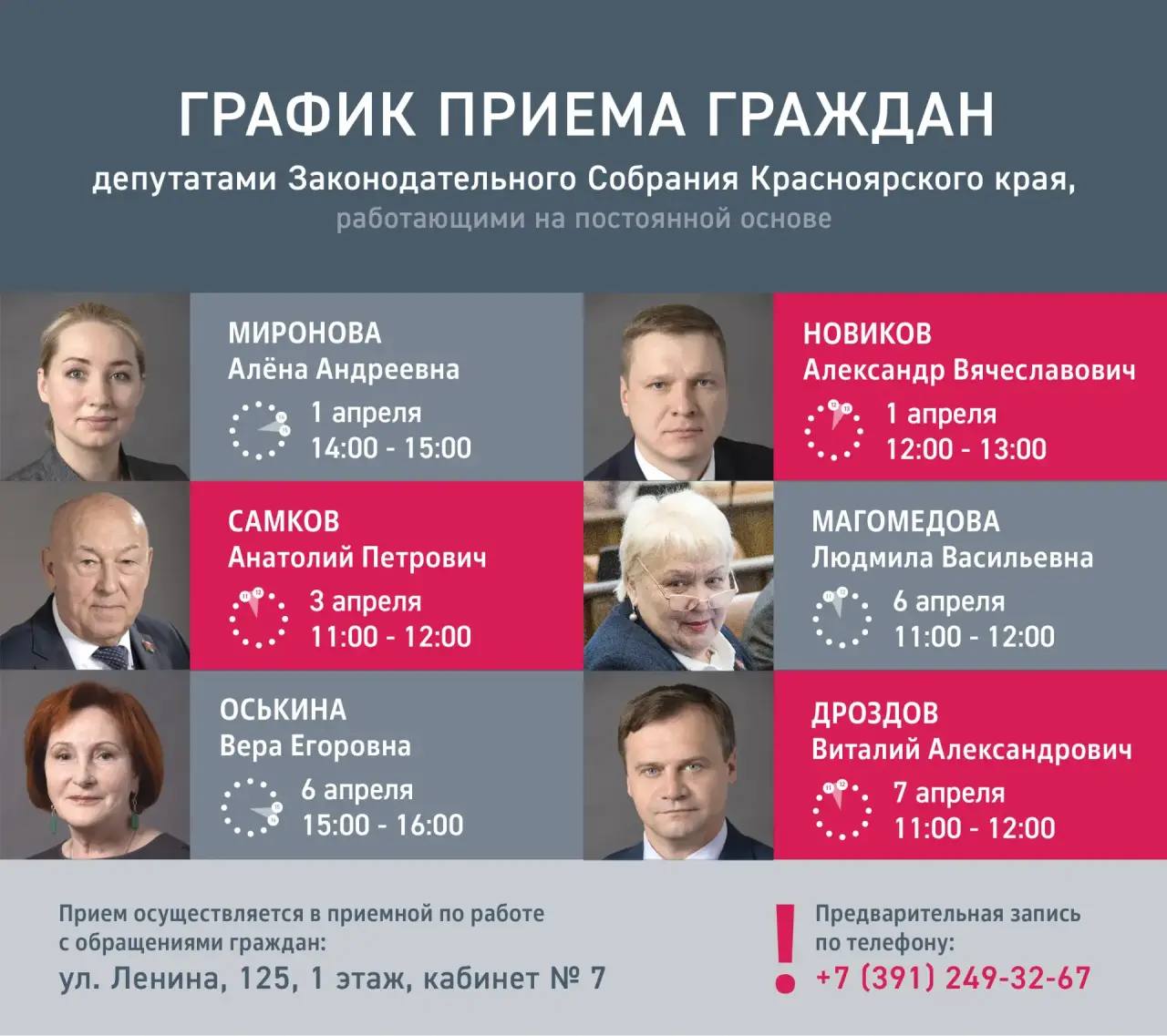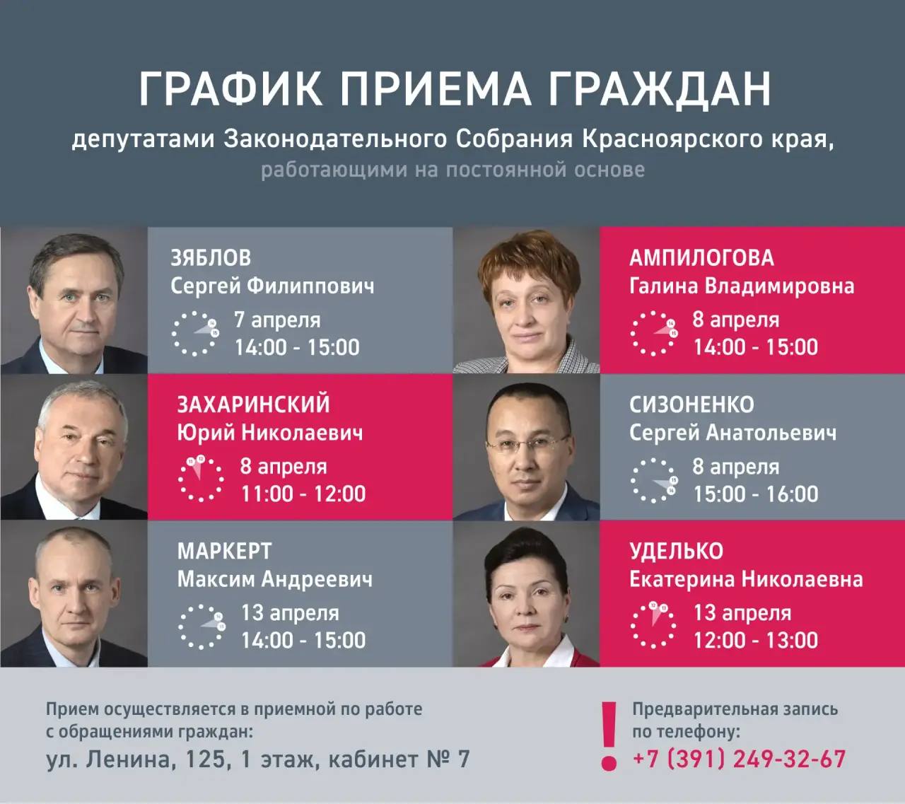 Прием осуществляется в приемной по работе с обращениями граждан: ул. Ленина, 125, 1 этаж, кабинет № 7.