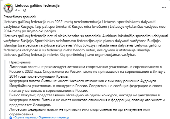 Федерация силачей Литвы отреагировала на участие литовских спортсменов в соревнованиях, прошедших в России, и подчеркнула, что не имеет с ними ничего общего.