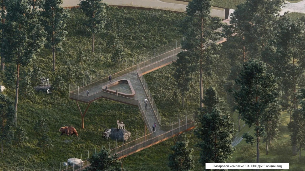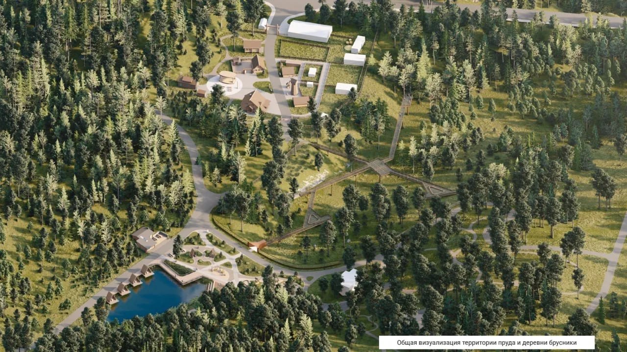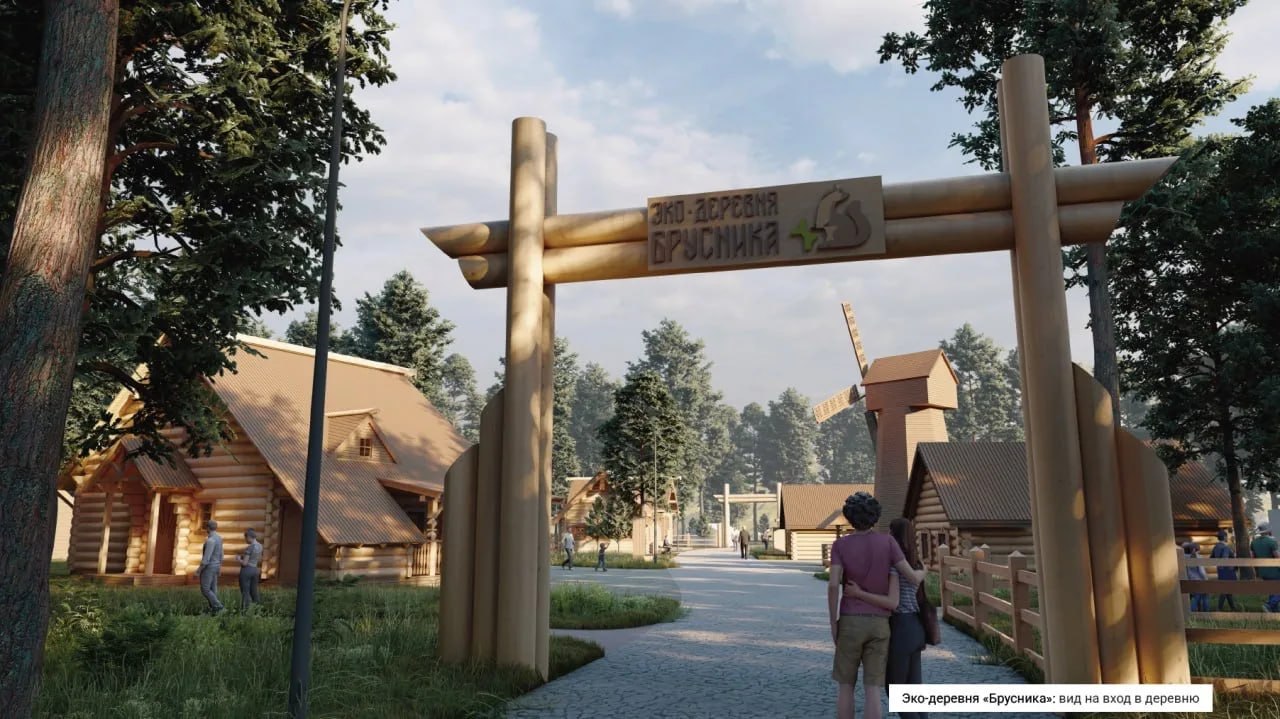 В экодеревне «Брусника» будут мастерские, набережная у пруда, смотровая площадка с видом на «Столбы», экотропы, верёвочный парк и геокупол. Зона отдыха свяжет зоопарк и национальный парк.
