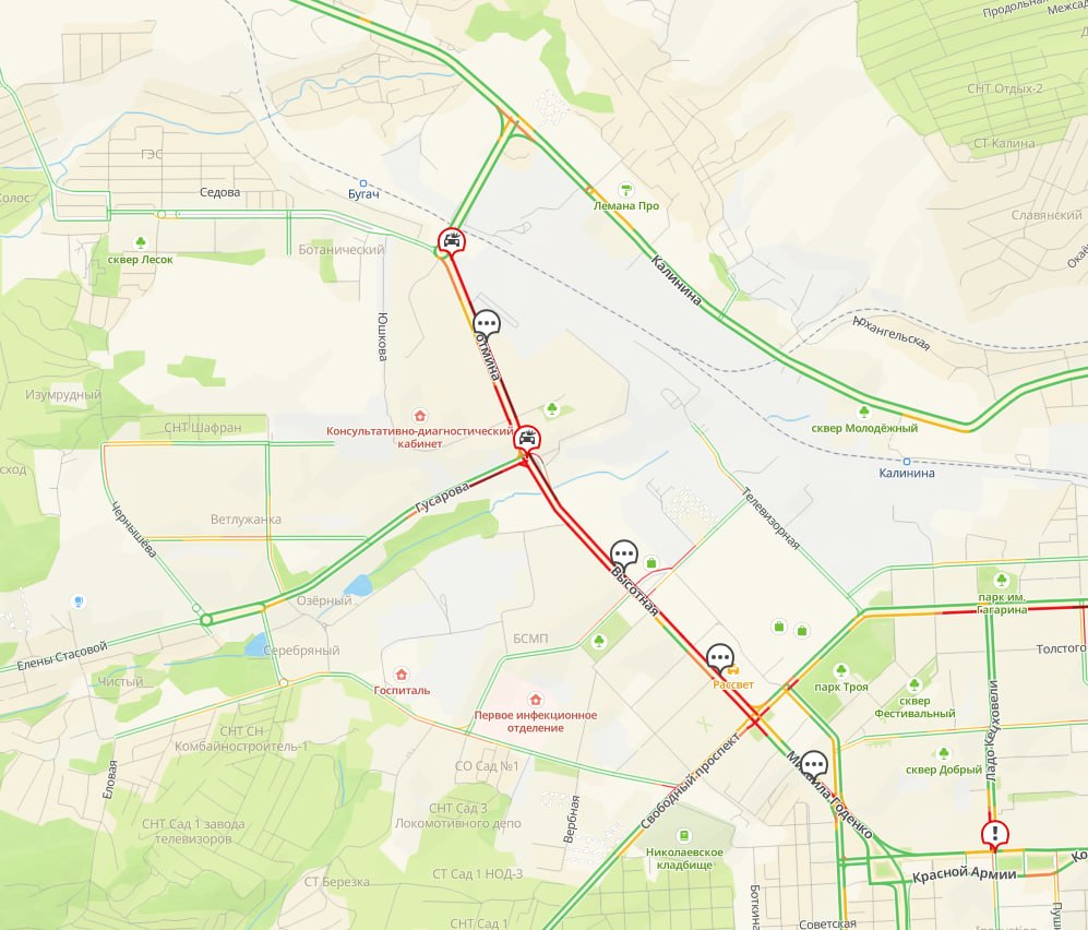Сейчас из-за аварии на Тотмина собралась пробка. По данным 2ГИС, движение затруднено от перекрестка на Свободном до кольца на Попова.