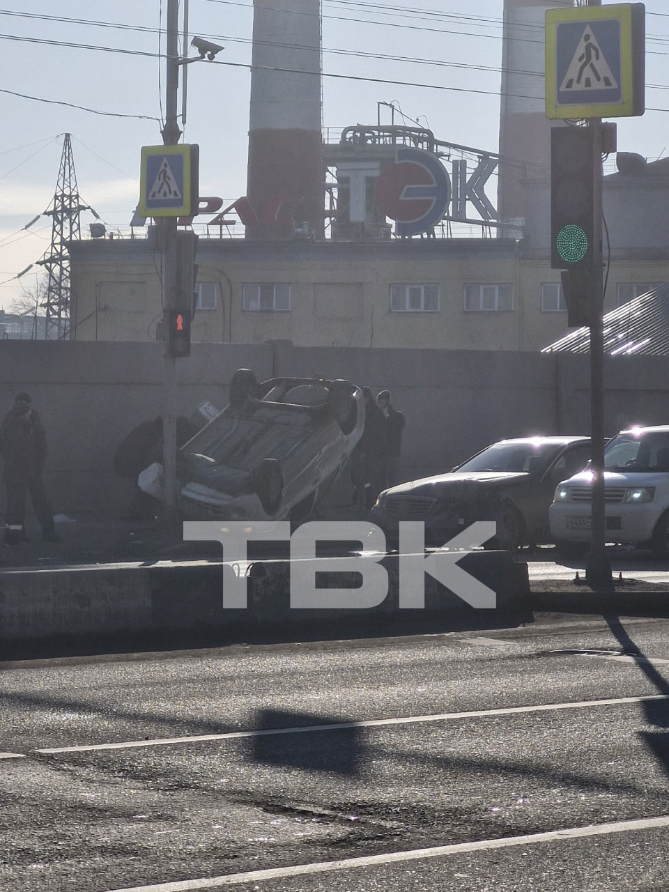 Судя по видео, двое водителей не поделили дорогу. После столкновения белая легковушка отлетела на тротуар и перевернулась.