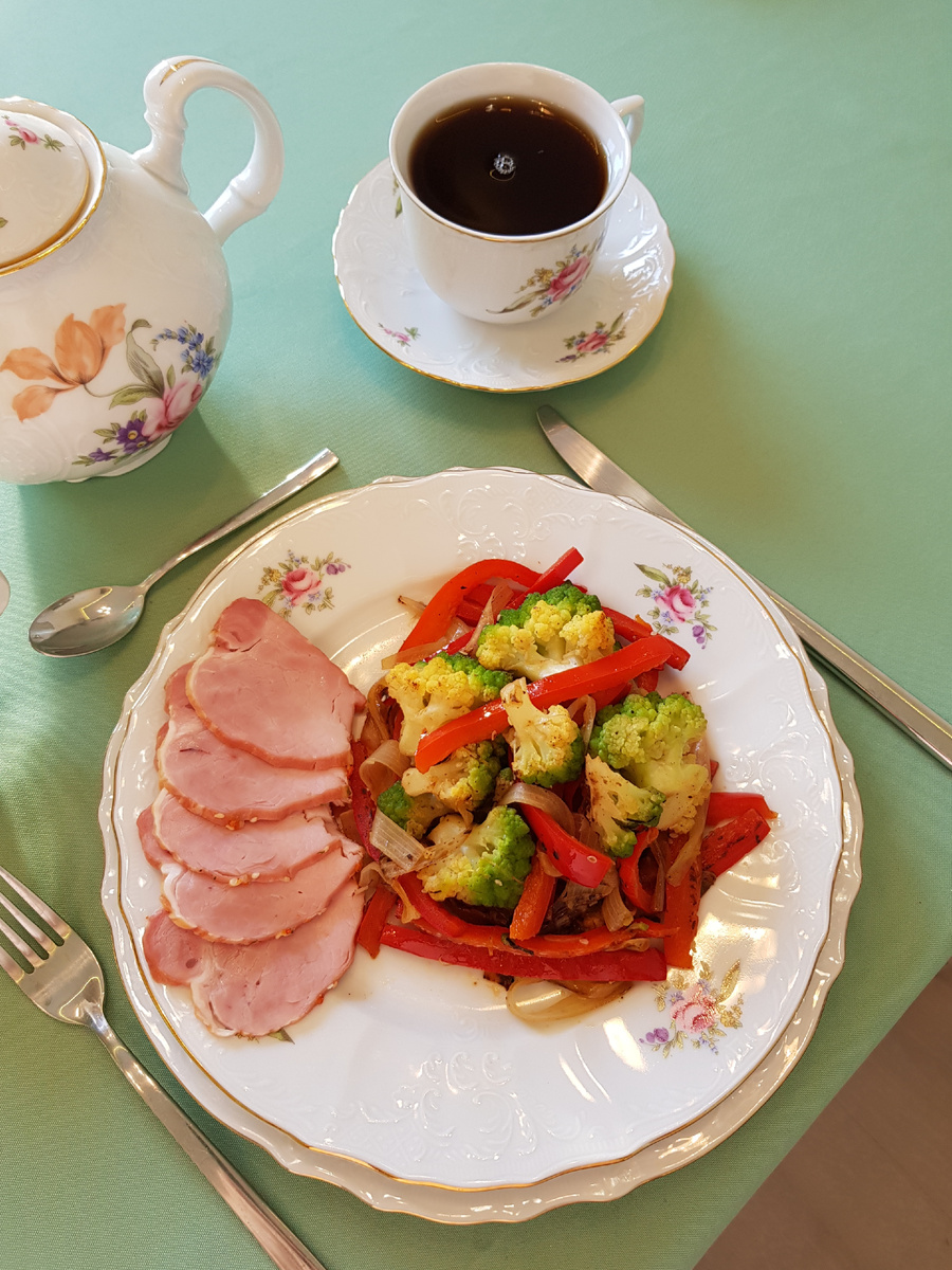 Подавать овощи на тарелках, при желании можно дополнить ветчиной.