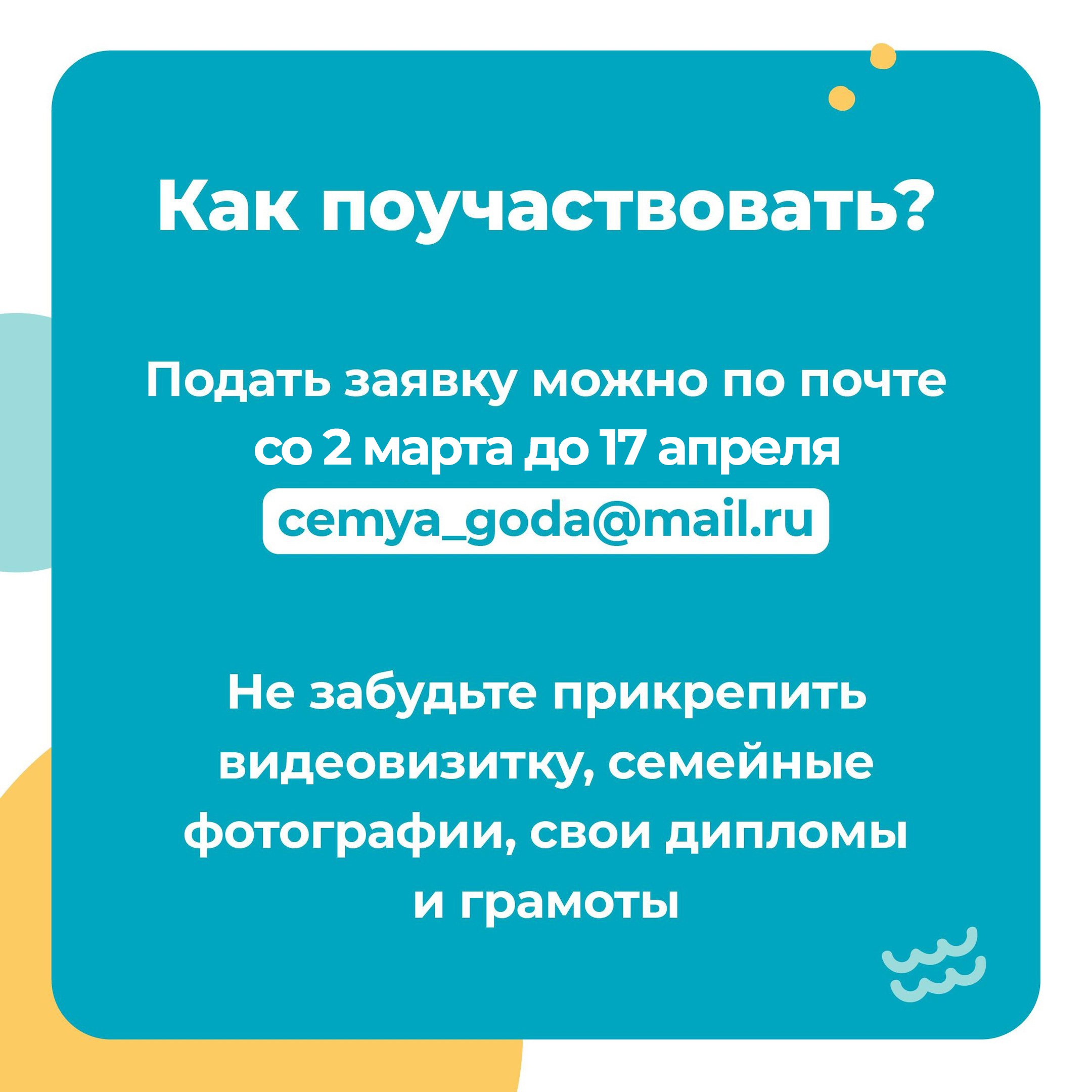 Для участия нужно заполнить заявку и отправить ее на почтовый ящик cemya_goda@mail.ru до 17 апреля. Не забудьте приложить видео, фото, копии дипломов и грамот, которые докажут, что ваша семья самая лучшая.