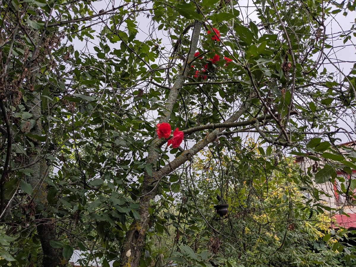 Этой весной роза не обошлась без неприятностей — один из самых длинных побегов повредился у основания. Тем не менее, сезон прошел успешно, и к осени растение снова расцвело, радуя глаз яркими цветами.