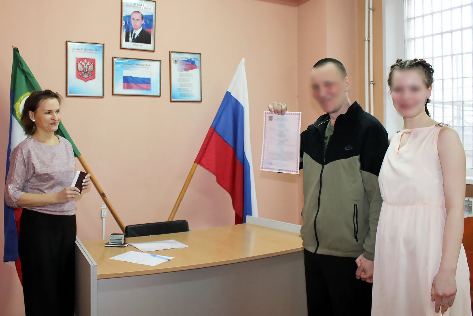 Сотрудники абаканского ЗАГСа и руководство колонии устроили выездную регистрацию. Торжество состоялось. После бракосочетания паре предоставили возможность побыть вместе три дня в комнате длительных свиданий, находящейся в учреждении.