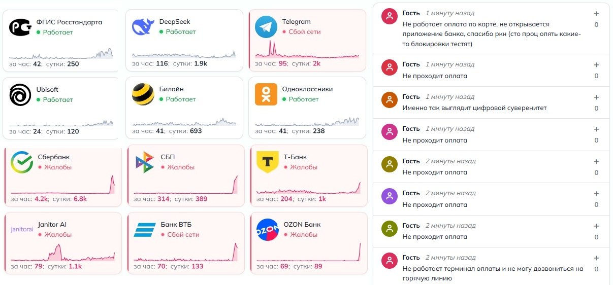 Судя по графикам, «отвалились» Сбер, ВТБ, Т-Банк и переводы по СБП.