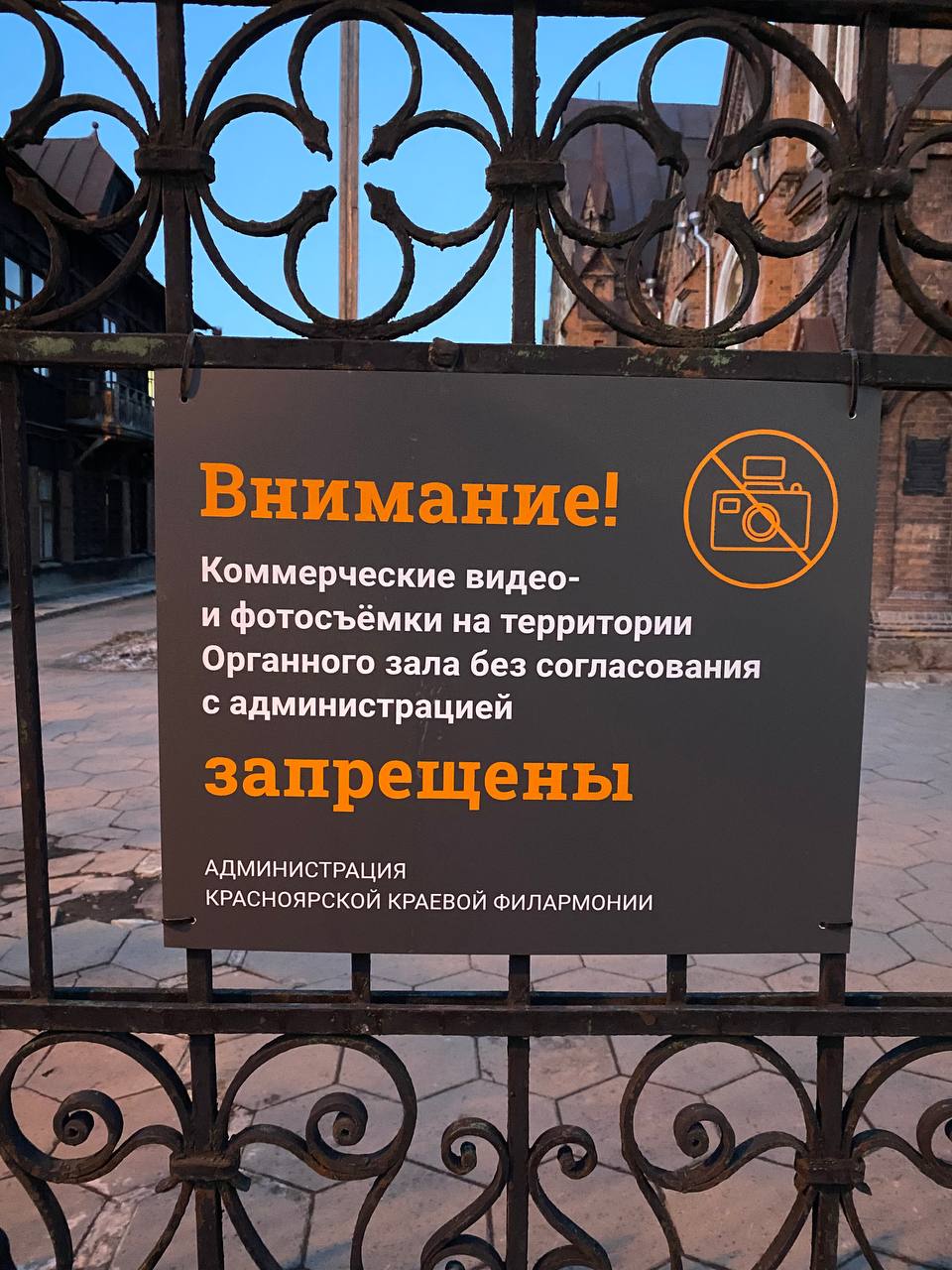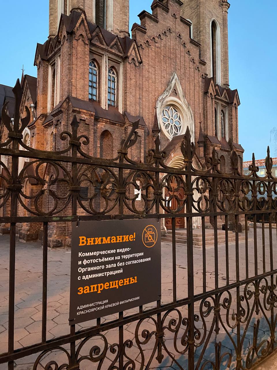 В Красноярске ограничили проведение съемок на территории костёла. На заборе у здания висит соответствующая табличка: внимание на нее обратил Telegram-канал «Друзья Красноярска». Надпись гласит: коммерческие видео- и фотосъемки на территории Органного зала запрещены без согласования с администрацией.