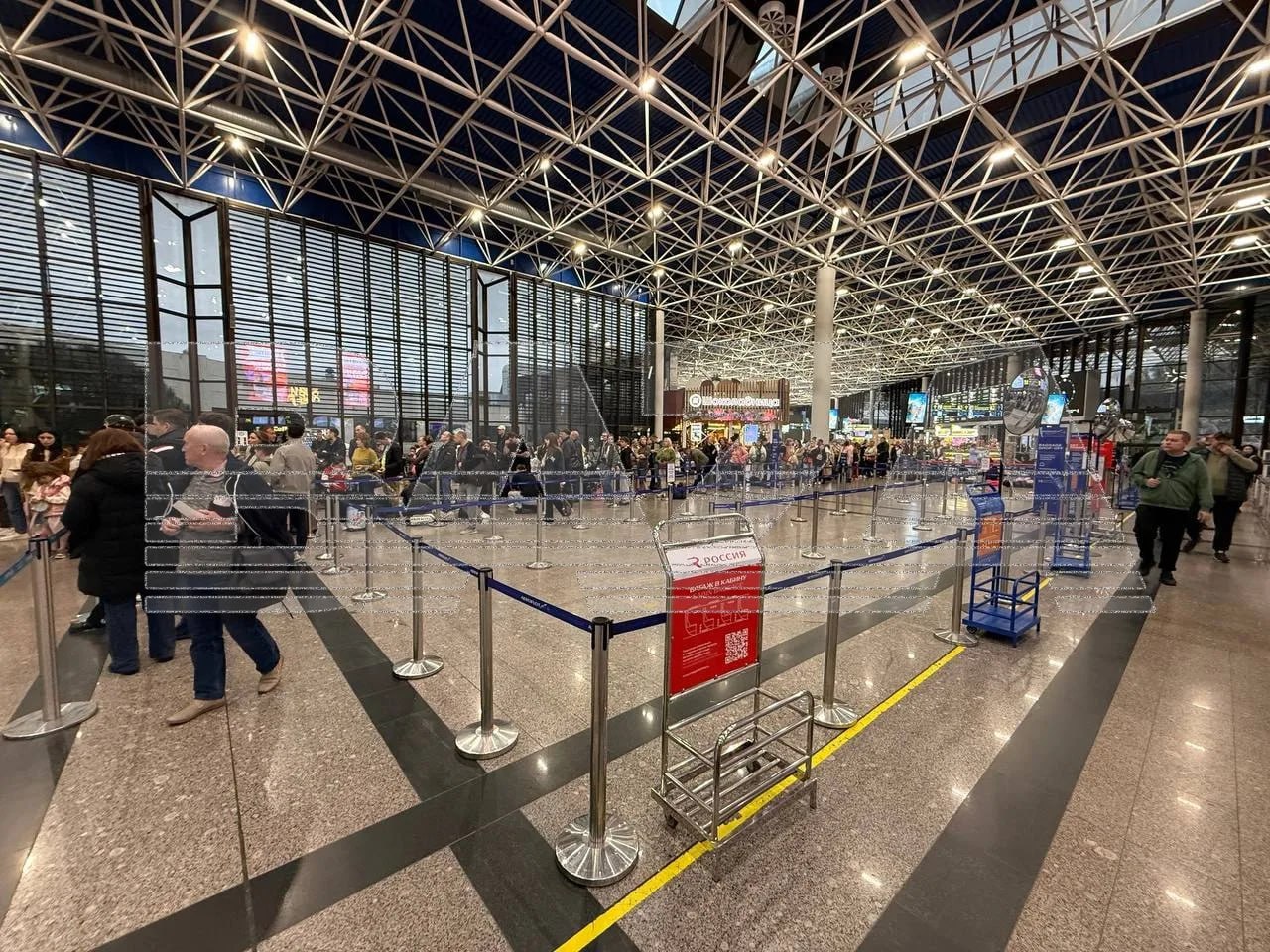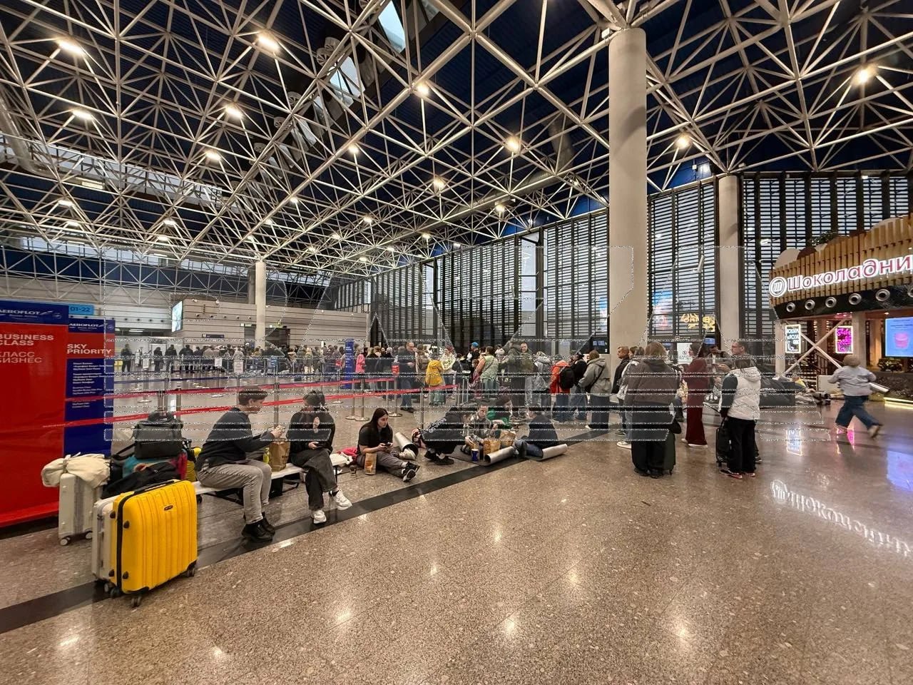 Некоторые пассажиры ожидают вылета уже более 16 часов. Люди вынуждены спать на полу в зоне вылета, собираются в огромные очереди, часть возвращается в гостиницы.