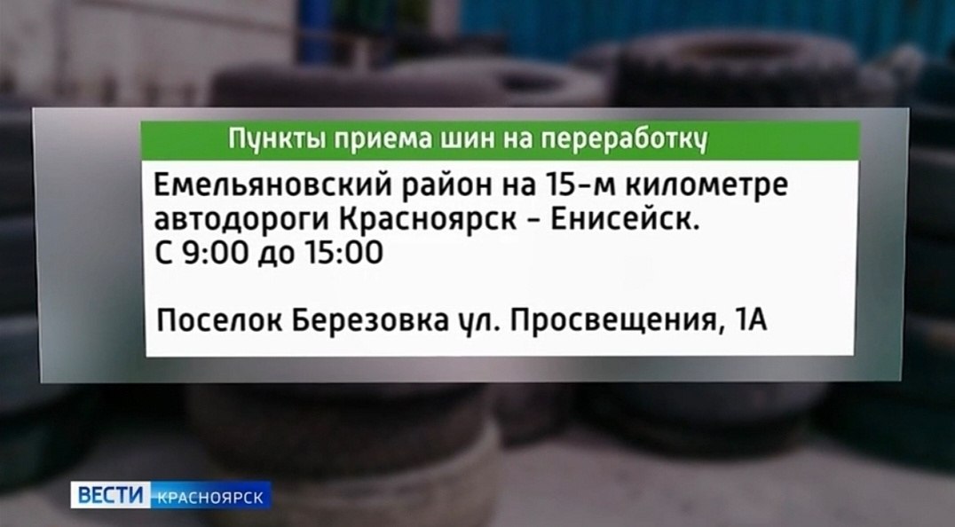 Принять авторезину от физических и юридических лиц готовы по адресу: Емельяновский округ, 15 км автодороги Красноярск-Енисейск. Здесь принимают шины от легковых и грузовых машин, в том числе шипованные. Не подходят индустриальные, сельскохозяйственные и вездеходные покрышки. Также отработанную резину на утилизацию примут в посёлке Берёзовка на улице Просвещения, 1А.
