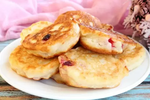 На сковороде необходимо разогреть растительное масло и с помощью столовой ложки выкладывать тесто, формируя оладьи. Как только одна сторона подрумянится, аккуратно переверните их на другую. Этим оладьям свойственно «стреляться» во время жарки, так что стоит предпочесть более аккуратный подход с ягодами, чтобы они в большинстве своём оказались внутри.