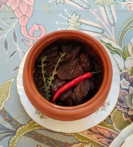 Теперь разложите мясо по глиняным горшочкам, добавив к нему перец, чеснок и тимьян. Закройте их ещё одним слоем мяса и залейте все это великолепие вином. На последнем этапе накройте горшочки крышками и поместите их в заранее разогретый духовой шкаф при температуре 150 градусов Цельсия. Тушите блюдо около 4 часов, чтобы мясо стало невероятно мягким.