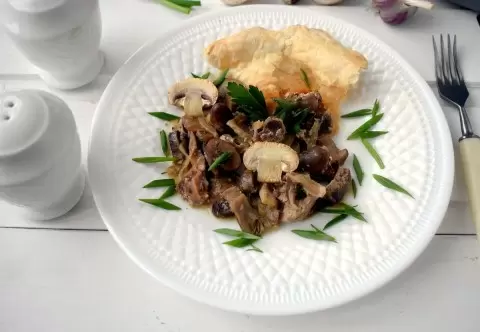 Последний штрих — раскатать тесто и накрыть им блюдо, смазав яйцом. Запекайте еще 10-15 минут до золотистой корочки. И вот, нежные куриные потрошки в сметанном соусе готовы к подаче!