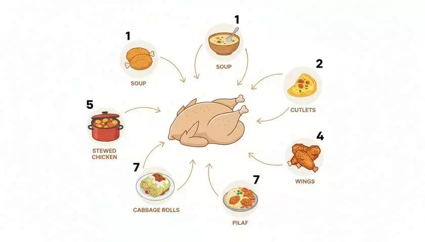 Курица — это один из самых универсальных и доступных продуктов, который можно использовать для экономного недельного меню. Вместо того чтобы выбрасывать еду, стоит научиться готовить разнообразные блюда из одной куриной тушки. Способы приготовления и идеи для ужинов — далее.