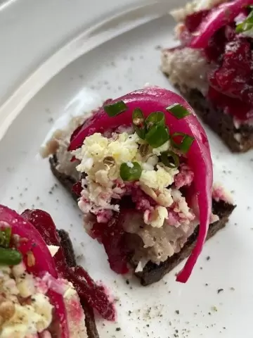 Известный салат «Селедка под шубой» обретает новое звучание благодаря оригинальному рецепту, который идеально подходит для хранения в холодильнике и обладает уникальными вкусовыми нотами. Вместо привычной «шубы» предлагаются интересные комплименты в виде форшмака с клюквенно-свекольным чатни, которое добавляет блюду изысканности.