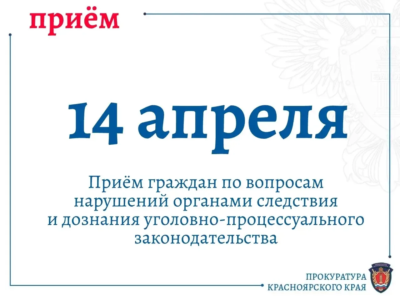 Заместитель прокурора края Рустам Гайфулин проведет личный прием по вопросам нарушений органами следствия и дознания уголовно-процессуального законодательства