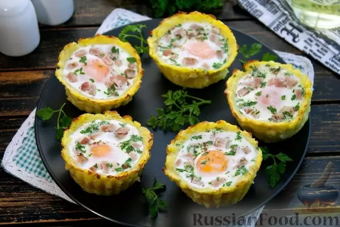 - Яичница с ветчиной в картофельных корзиночках: Традиционная яичница, запеченная в оригинальной картофельной корочке, станет настоящим центром завтрака. Уютно расположившись в формочках, она добавляет не только вкуса, но и яркости на стол.