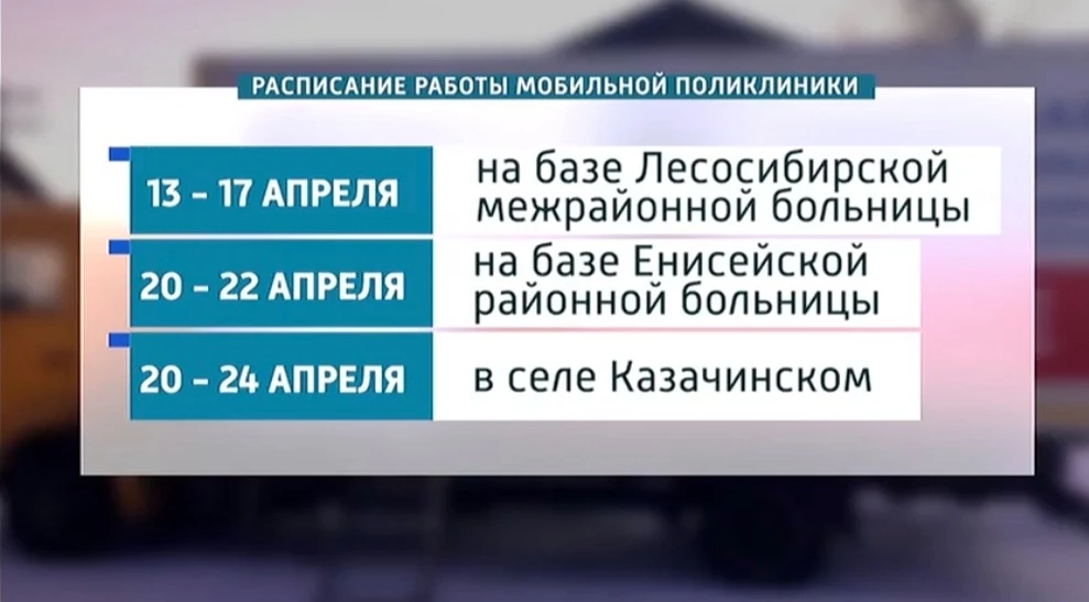 С 13 по 24 апреля туда приедет мобильная поликлиника. График работы вы можете видеть на экране. Больница на колесах объедет Енисейский, Казачинско-Пировский и Манско-Уярский округа. Принять на осмотр жителей края смогут кардиолог, невролог, эндокринолог, сосудистый хирург, аллерголог, а также врачи ультразвуковой и функциональной диагностики. Пациентам будут доступны современные методы диагностики, включая УЗИ. Также будут работать передвижные кабинеты флюорографии и маммографии, для этих процедур направление не требуется.