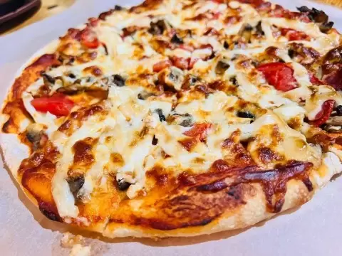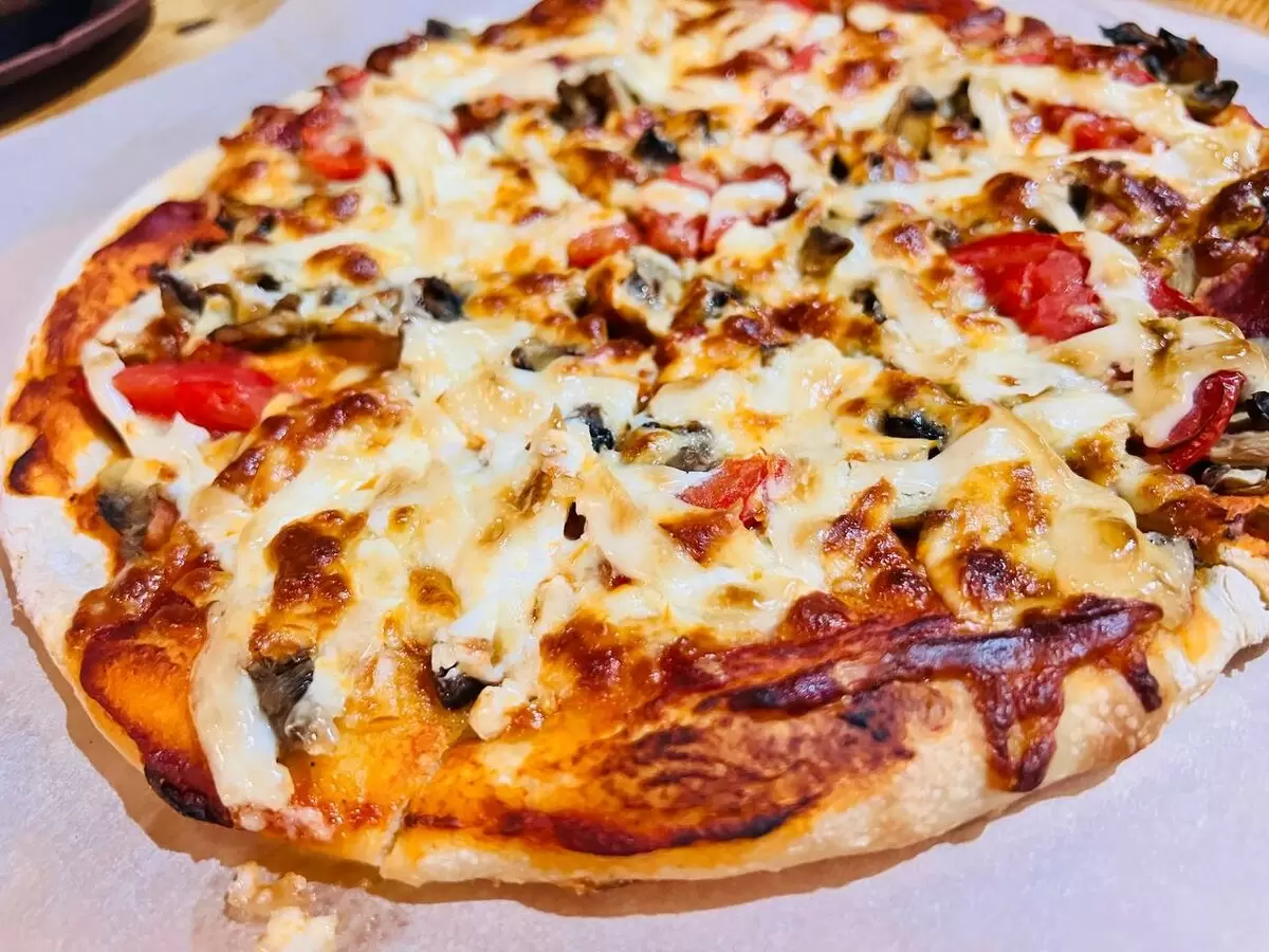 Выпекание: Разогреть духовку до 220°C. Выпекать пиццу 15-20 минут, пока корочка не станет золотистой, а сыр — расплавится.