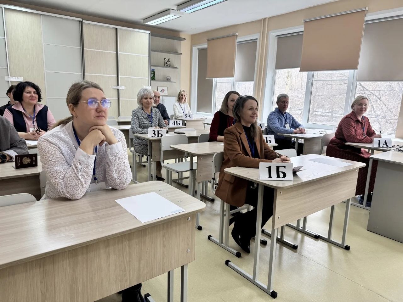 Процедура такая же, как и у детей: взрослые прошли регистрацию, оставили личные вещи, за парты сели по одному, с собой взяли только паспорта и ручки.