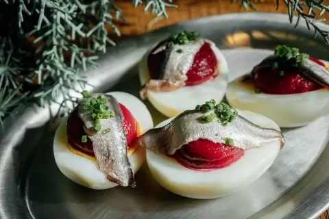 Яйца следует сварить вкрутую. Свеклу запечь в фольге, а затем перемешать с маслом и лимонным соком до получения кремовой текстуры. Наполнить половинки яиц свекольным кремом и украсить анчоусами.