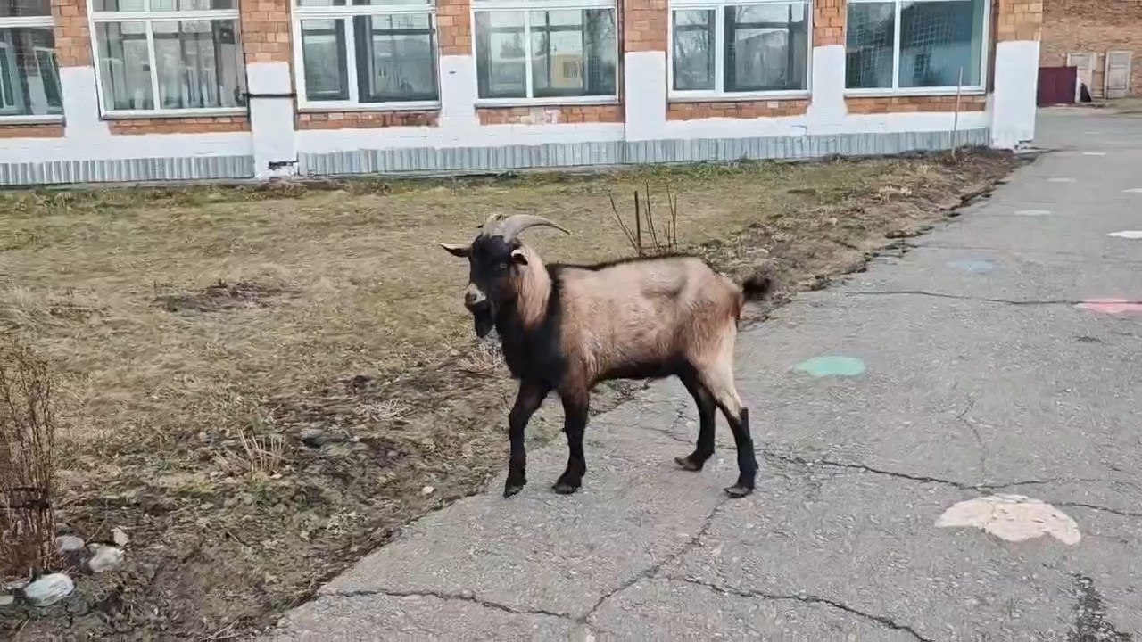 Судя по всему, козел ушел с подворья – выглядит хорошо и совсем не боится людей. Рогатый красавец отправился гулять и забрел во двор школы.