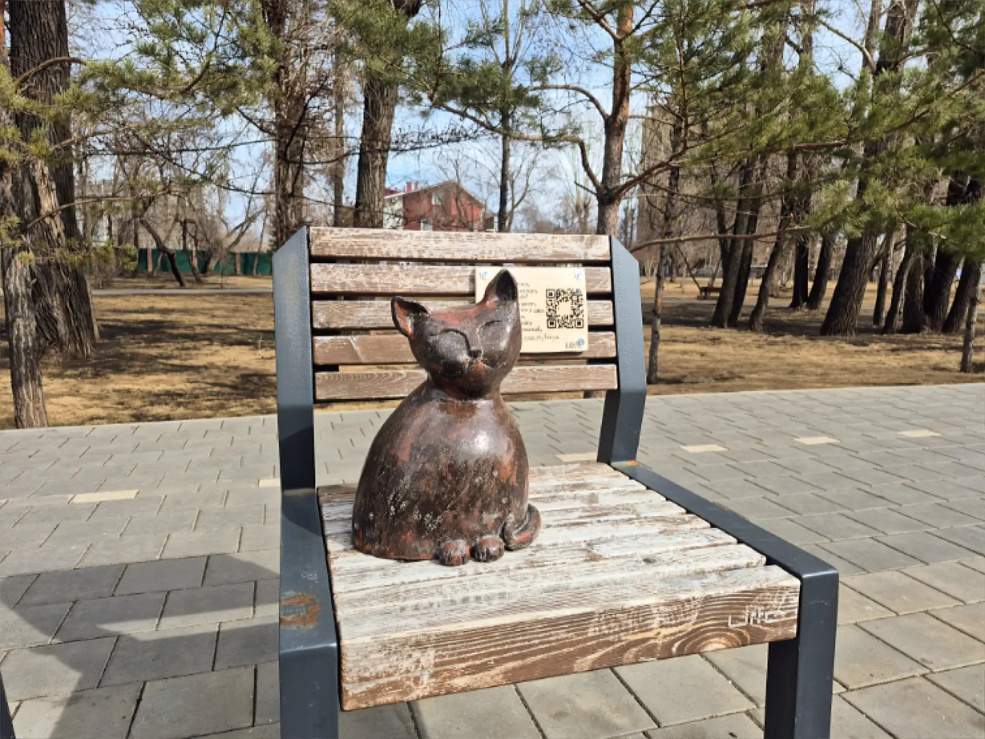 Он тихонько сидит на лавочке и смотрит на Качу. Фигурку установили по проекту «Ты — город». У кота даже есть собственная группа в соцсетях, где он «рассказывает» о своих приключениях.