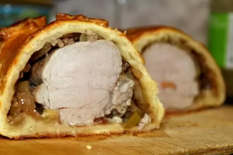 Сочетание нежной свинины, хрустящего слоёного теста, сладости яблок и тепла тимьяна представляет собой удивительное блюдо, способное удивить даже самых требовательных гурманов. Подрумяненная свиная вырезка, завернутая в тесто вместе с луком, чесноком и яблоками, станет изюминкой любого обеда или ужина.