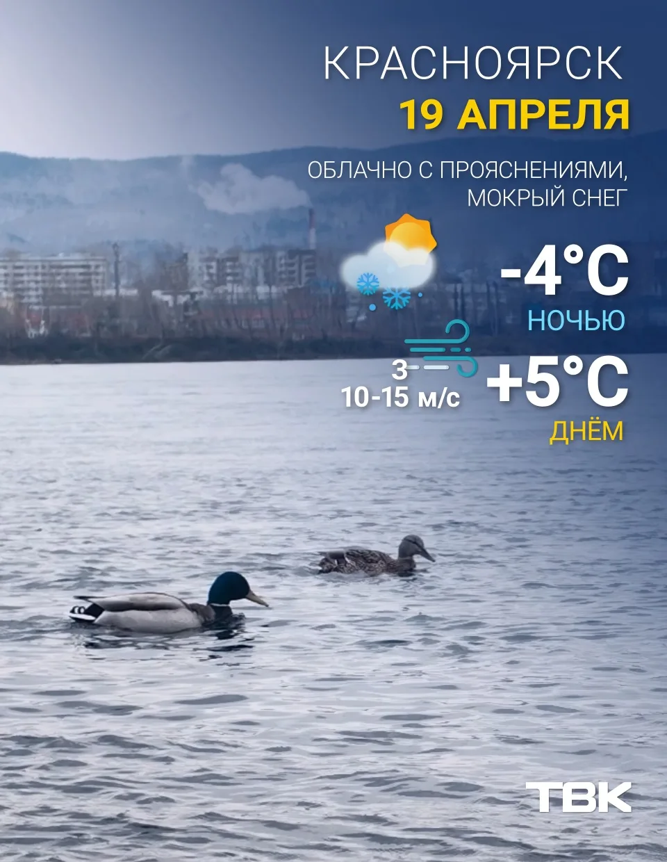 Погода на 19 апреляНочью -4Днём +5Ветер до 15 м/с, мокрый снегЧитать нас можно и в МАХ