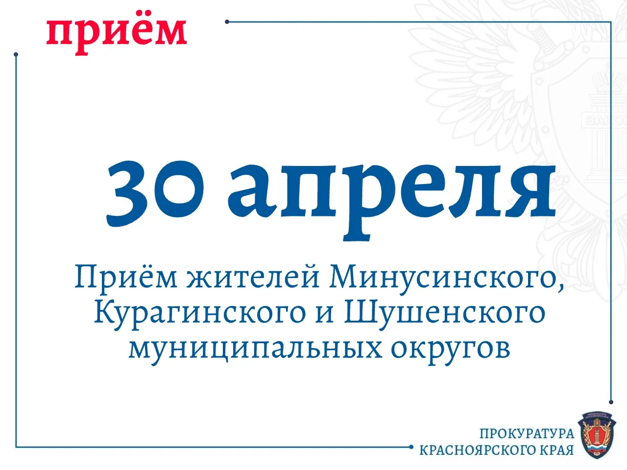Прокурор края Роман Тютюник совместно с руководителями ГСУ СК России по краю и Хакасии Алексеем Ереминым, ГУ МВД России по краю Александром Соловьевым, ГУФСИН России по краю Антоном Ефаркиным проведут в г. Минусинске личный прием жителей Минусинского, Курагинского и Шушенского муниципальных округов