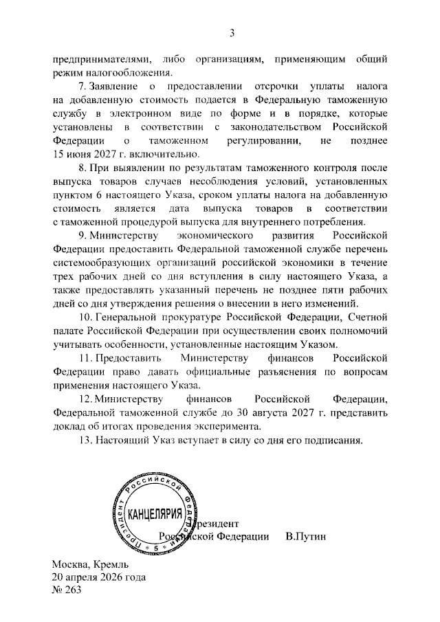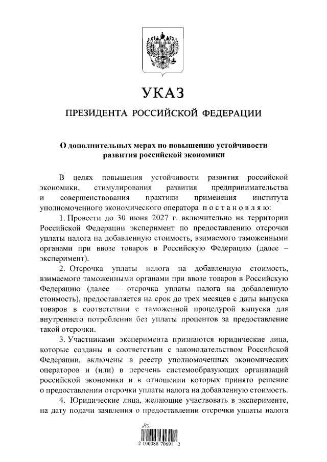 Президент России подписал указ о запуске специального эксперимента для импортёров