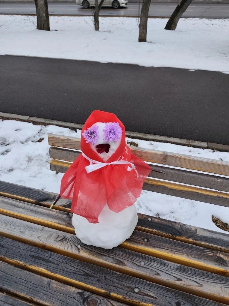 Снег и цветы — отличное сочетание для весеннего снеговика