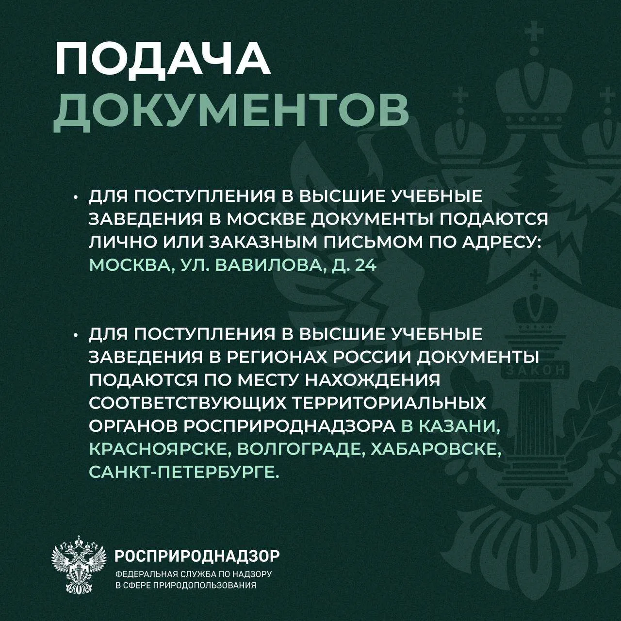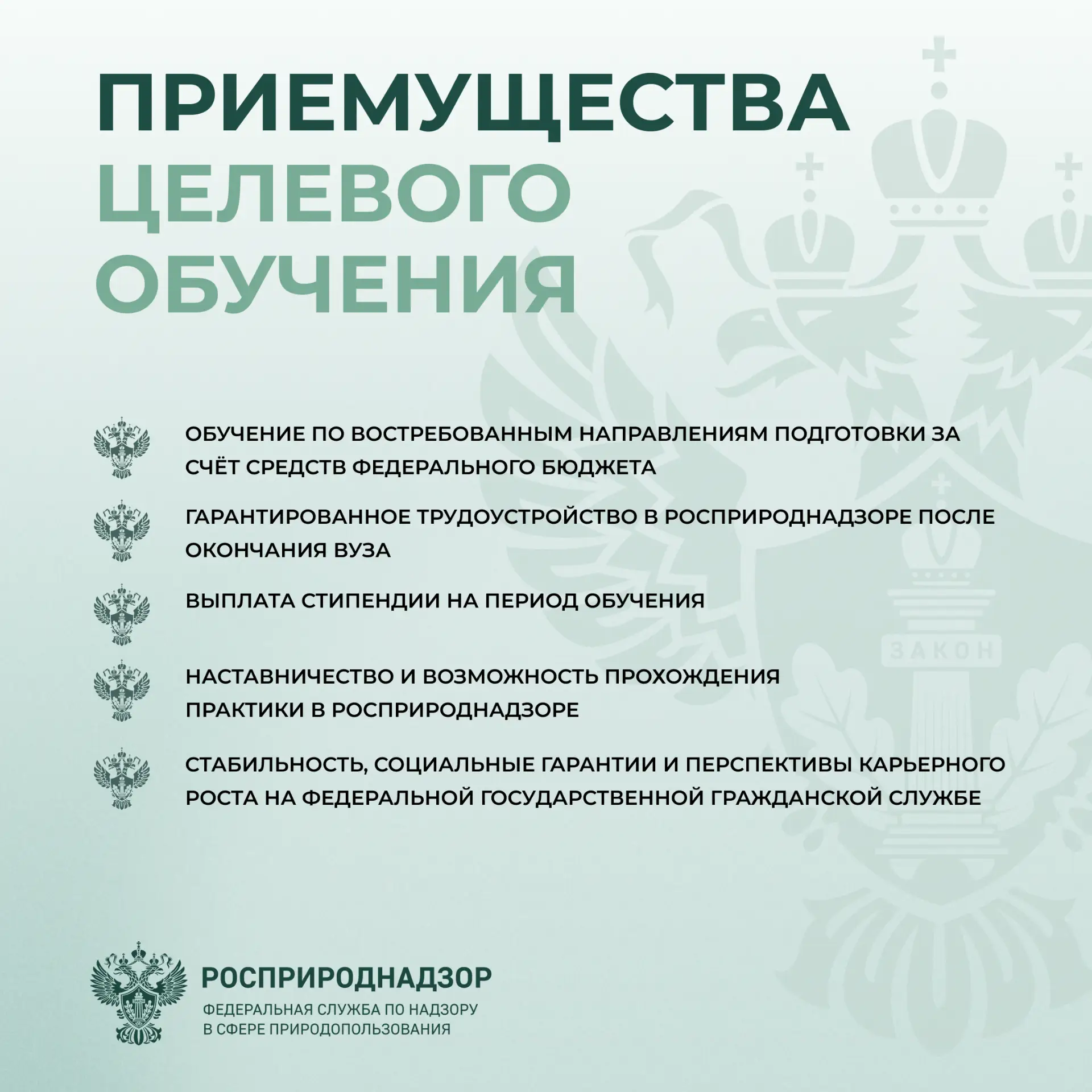 Росприроднадзор объявляет конкурс на целевое обучение с последующим трудоустройством на федеральную государственную гражданскую службу — в центральном аппарате или территориальных органах.