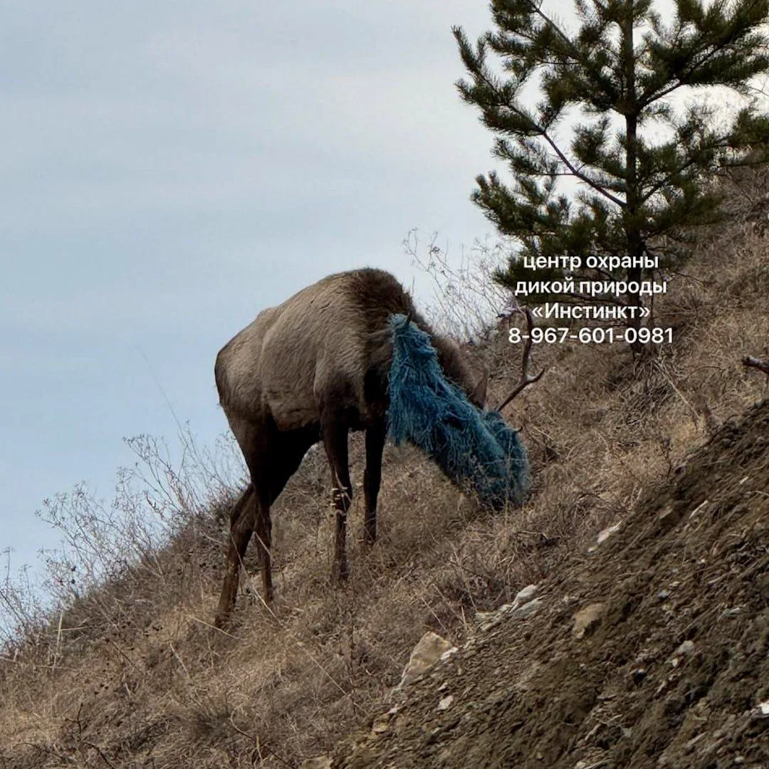 Самка запуталась в тряпке, которая обмотала животному рога и закрыла обзор. Маралуха ничего не видит и с большим трудом может есть. Сейчас специалисты ищут добровольцев, которые помогут освободить животное из ловушки.